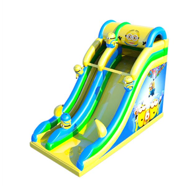 This is an inflatable slide themed with Minions. It features bright colors including yellow, blue, and green. The slide has two lanes, and there are several Minion characters placed on different parts of the slide, adding a lively and fun atmosphere. On the side of the slide, there is a large image of Minions, enhancing the thematic appeal. This inflatable slide is likely to be very popular among children, especially fans of the Minions franchise, as it combines the fun of sliding with the charm of their favorite characters. It can be used in various settings such as children's parties, outdoor events, or amusement parks to provide an engaging and entertaining experience for kids.